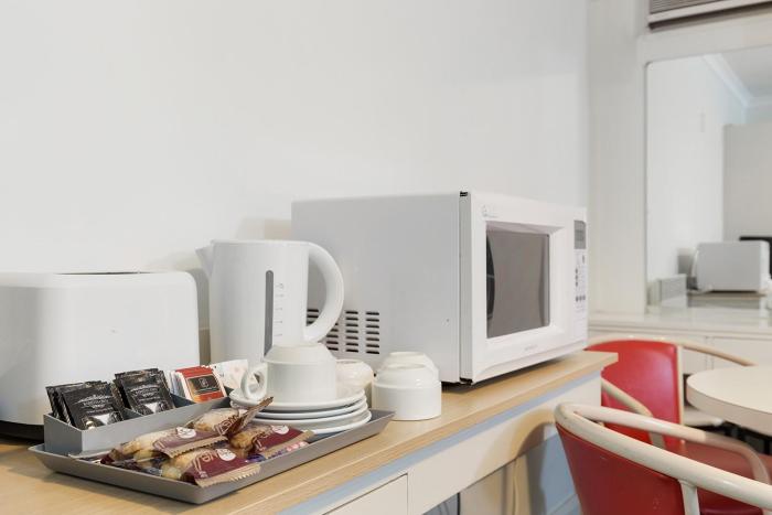 It was comfortable but cupboard surfaces were clearly finger marked and dirty; and the pull down cupboard made reaching the hot water jug and coffee and tea facilities not so easy for short people. A...