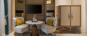 Rooms feature a living room and a bathroom. Air conditioning ensures comfortable temperatures. Some rooms include a balcony. Rooms include a king-size bed. Guests can also reserve separate bedrooms. Children's beds can be requested for younger guests. A safe and a minibar are also available. Additional features include a mini fridge and a tea/coffee station. An ironing set is provided for guests' convenience. A direct dial telephone, a television with satellite/cable channels, a radio and WiFi are provided as well. Amenities provided in the rooms include slippers and a daily paper. A hairdryer and bathrobes are available in the bathrooms, which are equipped with a shower and a bathtub. The resort has non-smoking rooms and smoking rooms.