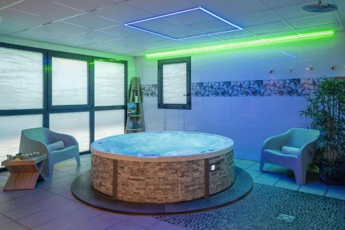 The pleasantly heated water of the outdoor pool area guarantees comfortable swimming. Guests can relax and enjoy the outdoor lounge chairs and umbrellas provided. The hot tub in the pool area promises pure relaxation. There are a variety of recreational facilities and services to choose from, including a gym, a spa, a sauna, a steam bath, massage treatments and hydrotherapy treatments.