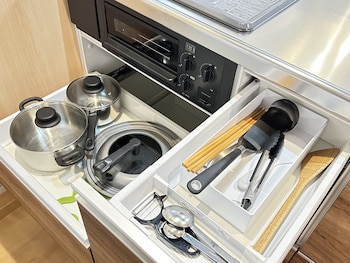 Features include a cooktop, a microwave, an ironing set and a TV.