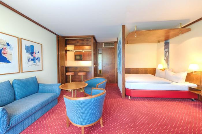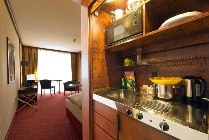 Rooms feature a living area, a kitchen and a bathroom. Air conditioning and central heating ensure comfortable temperatures. A balcony is included as a standard feature in some rooms. All rooms are carpeted and include a double bed or a king-size bed. Separate bedrooms can be reserved. Children's beds can be requested for younger guests. A safe and a minibar are also available. There is a fully-equipped kitchenette with a refrigerator, mini fridge, microwave and tea/coffee station. An ironing set is provided for guests' convenience. A direct dial telephone, a television with satellite/cable channels, a radio and WiFi are provided as well. Bathrooms are equipped with a shower, a bathtub and a whirlpool bath. A hairdryer is also provided. Wheelchair-friendly rooms with wheelchair-accessible bathrooms are also available at the hotel. Family rooms are available for parents with children.