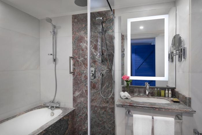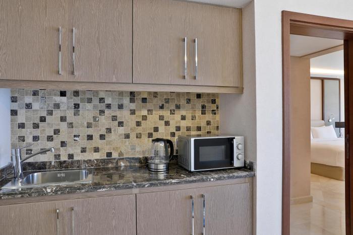 Rooms are equipped with air conditioning and central heating. Most units have a sea view. The rooms have a king-size bed and a sofa bed. Separate bedrooms are available. Extra beds or children's beds can be provided upon request. A safe, a minibar and a desk are also available. The kitchenette comes with a refrigerator, a mini fridge and a tea/coffee station. An ironing set is provided for guests' convenience. A telephone, a flatscreen television with satellite channels and WiFi are provided as well. The daily newspaper is laid out for guests in the the rooms. A hairdryer and bathrobes are available in the bathrooms, which are equipped with a bidet. 4 wheelchair-friendly rooms can be reserved. Family rooms are available for parents with children.