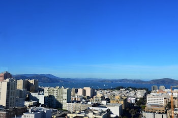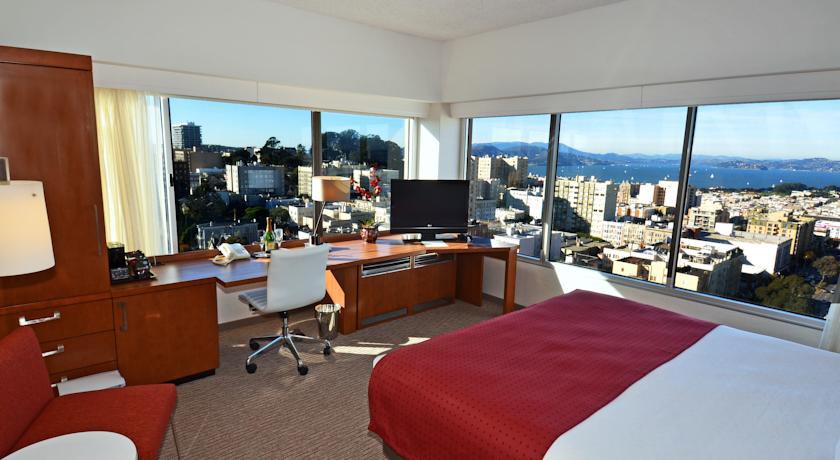No views of the Golden Gate Bridge. Noisy as windows are not double panned. Loud a/c and heater. Mediocre food. Built in the 1965. Slow elevators. For $10.00 less enjoy the Hilton Financial...