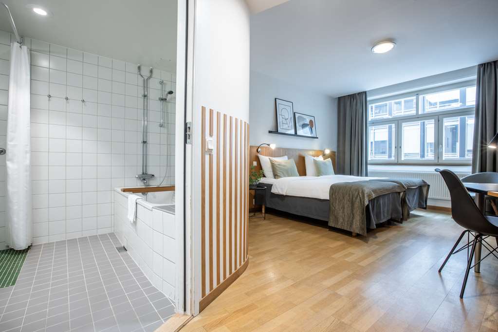 Air conditioning ensures that rooms maintain comfortable temperatures. Rooms include a double bed. Valuables can be securely stored in a safe. A mini fridge and a tea/coffee station are standard features. An ironing set is provided for guests' convenience. There is a direct dial telephone, a TV, a radio and WiFi in the rooms. Bathrooms include a hairdryer and are equipped with a shower and a bathtub. The hotel has family rooms and 95 non-smoking rooms.