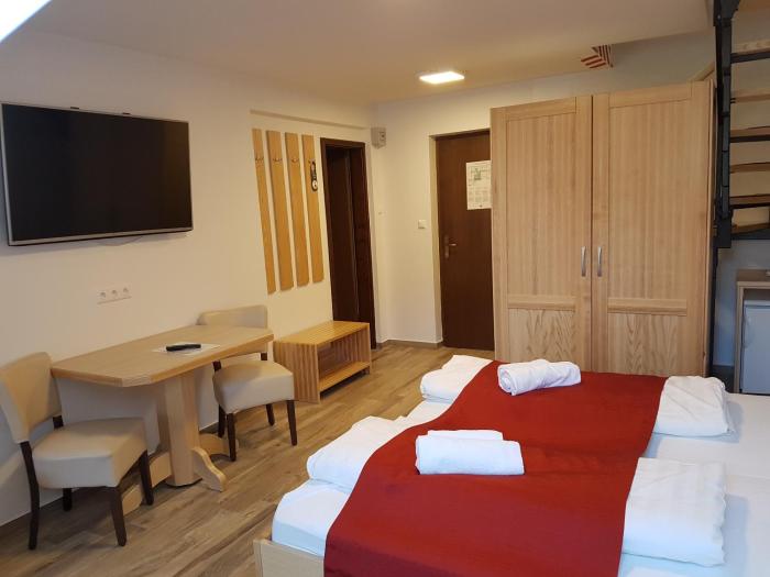 Within walking distance to the lake, small supermarket and few restaurants nearby, superfriendly staff, extremely clean rooms, great breakfast buffet, quiet (at least at night, can't blame them for...