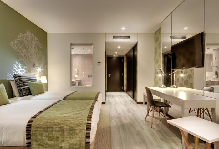 Rooms are equipped with air conditioning and central heating. Guests can enjoy the sea view from a balcony or terrace. Rooms include a double bed. A safe and a minibar are also available. Equipped with a direct dial telephone, a television with satellite/cable channels, a radio and WiFi, the rooms provide many ways for guests to stay connected and entertained. A hairdryer and bathrobes are available in the bathrooms, which are equipped with a shower and a bathtub. Bathrooms with wheelchair access can also be reserved. The hotel has 55 non-smoking rooms.