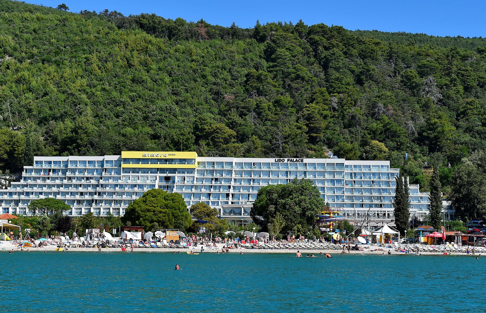 The hotel is situated just by the beach and close to Rabac. The view from the hotel is great. There is not enough sunbeds for the hotel guests. Sunbeds at the beach costs 50 kuna each and parasols 30...