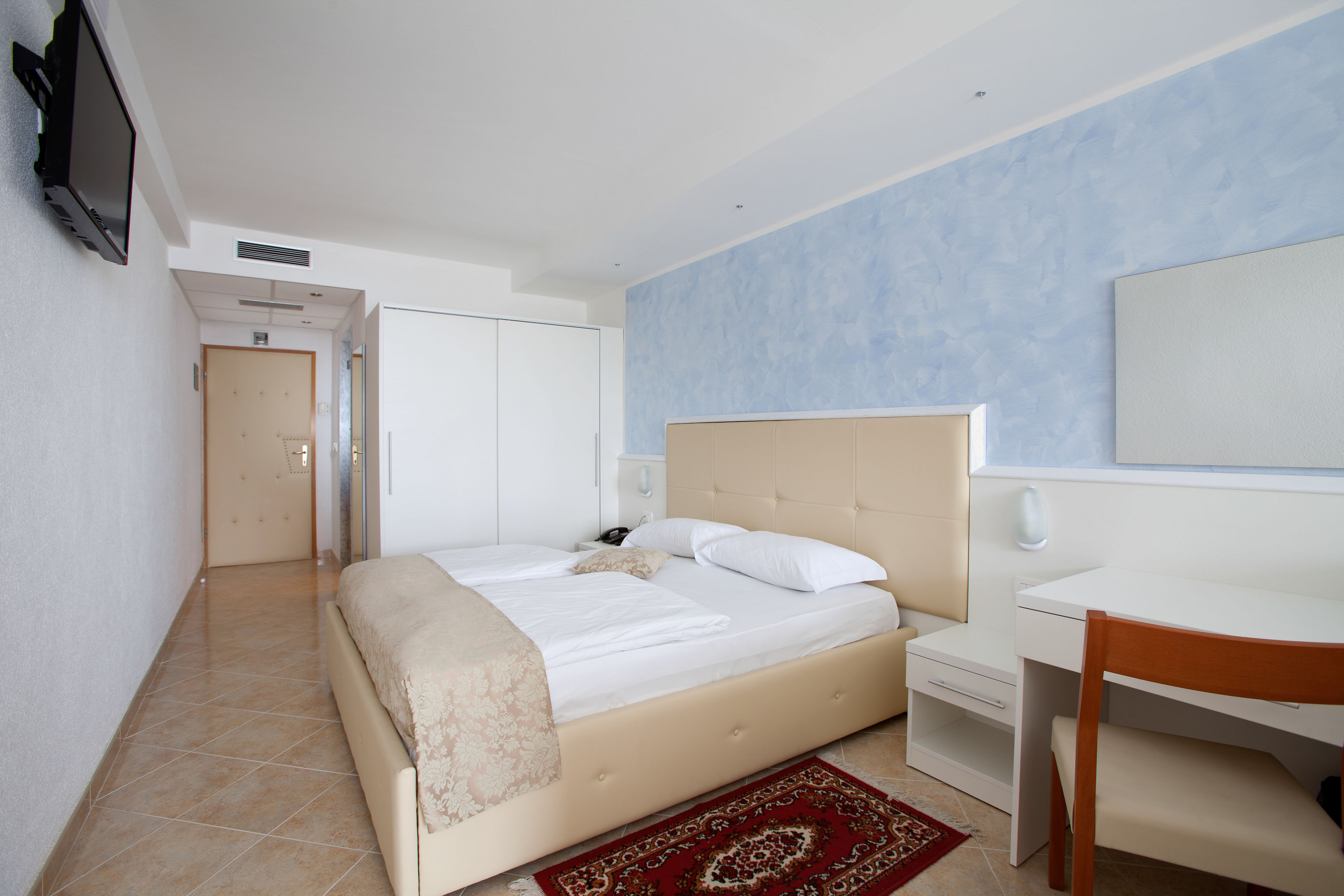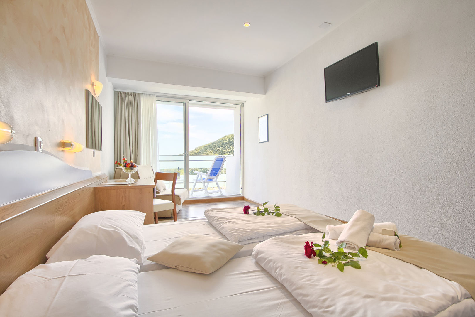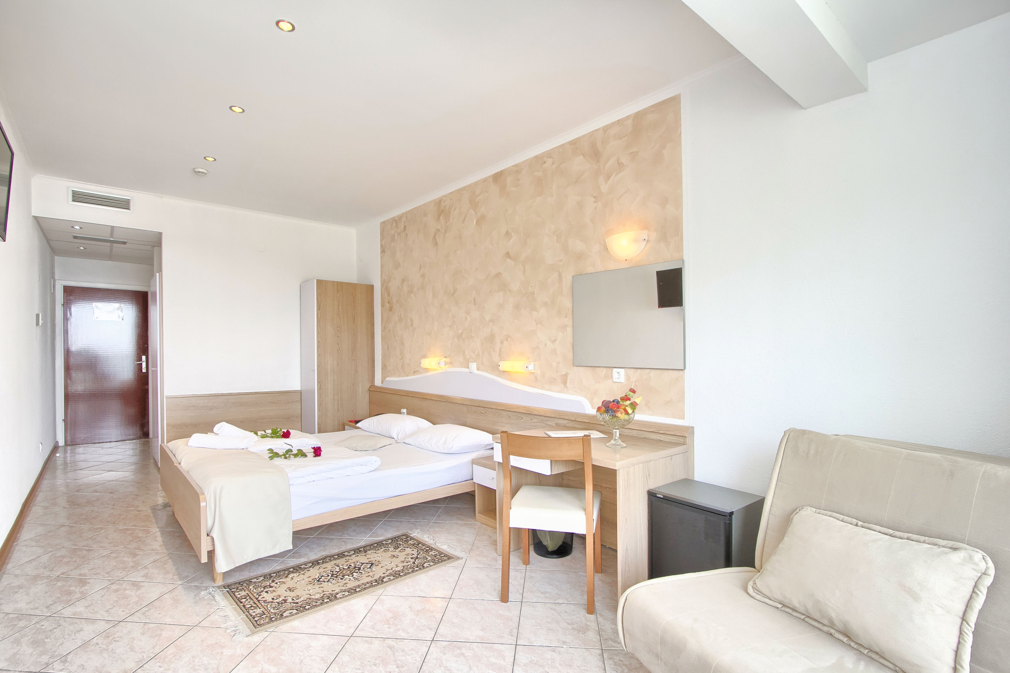 Air conditioning and central heating ensure that rooms maintain comfortable temperatures. Guests can enjoy the sea view from a balcony or terrace. Rooms have a double bed or a sofa bed. Children's beds and extra beds can be requested for younger guests. A safe provides secure storage for guests' personal property. Guests will also find a refrigerator included among the standard features. A telephone, satellite television, a radio and WiFi are provided as well. Bathrooms are equipped with a shower and a bathtub, as well as a hairdryer. Family rooms are available for parents with children.