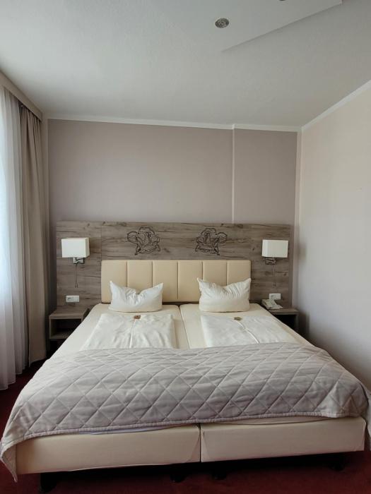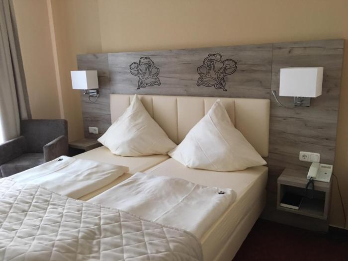 Right in the middle of Bad Salzuflen with a nice view of the Rosengarten. Nice-sized room with a great bed, so comfortable I could have spent all day in it. Breakfast was not included in the price...