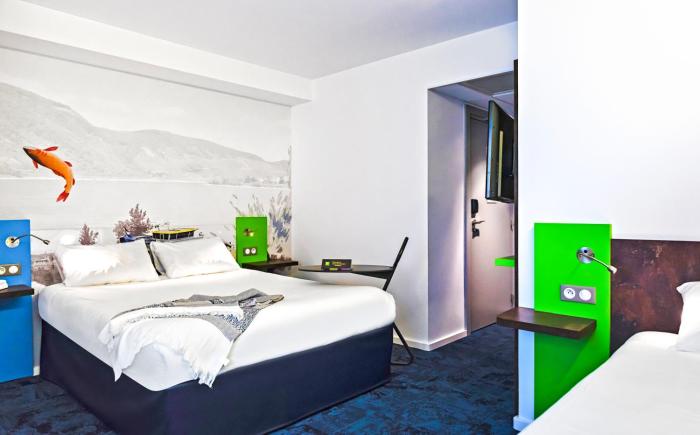 New and modern hotel with small (almost tiny) rooms, very clean and neat. There is a free wifi, TV and AC in the room. In restaurant they serve typical french breakfast - fresh bread and baguettes...