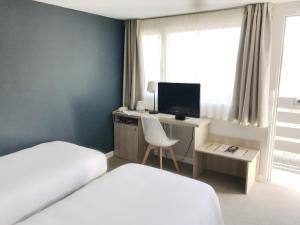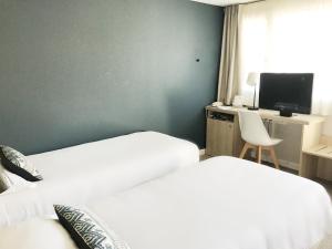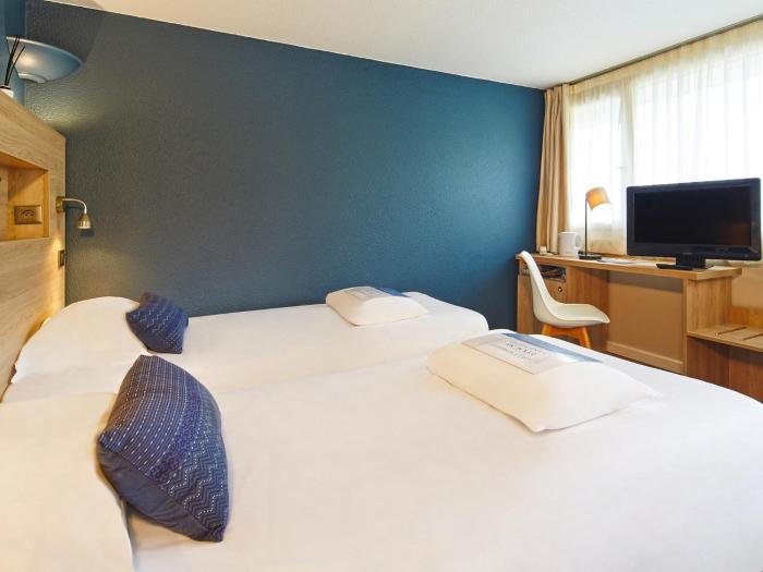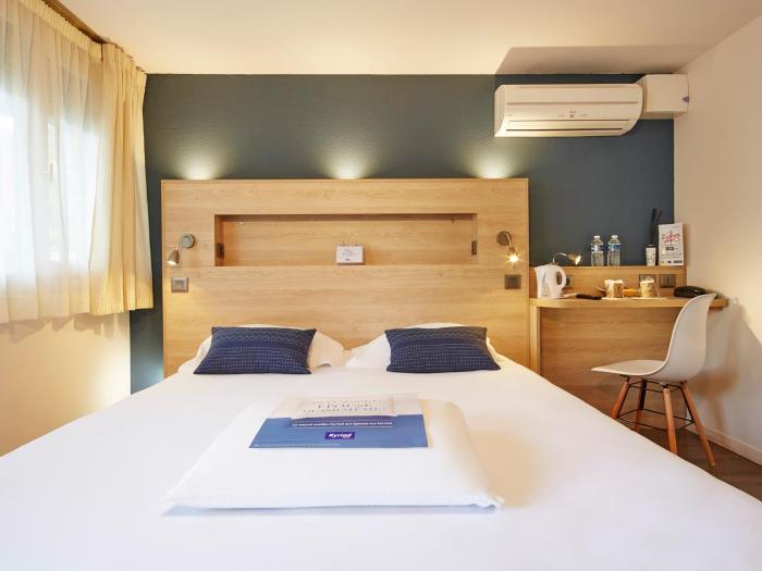 Chambre petite mais pourvue de tout...plateau de courtoisie, très bonne literie, Wifi. Les chambres avec vue sur jardin sont calmes (peut être que l'hôtel n'était pas plein mais aucun bruit...