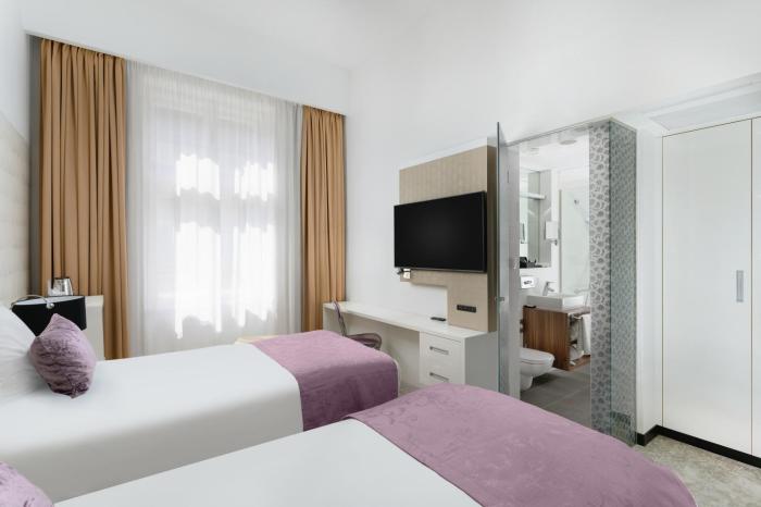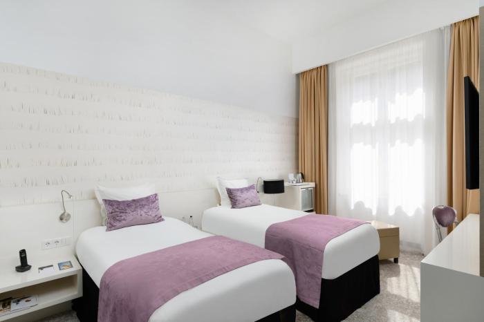 Stayed at Nemzeti for 3 nights with a friend; we both had separate double bed rooms on first floor. Upon arrival I asked to be moved to a room with a bath as opposed to a shower. This was...