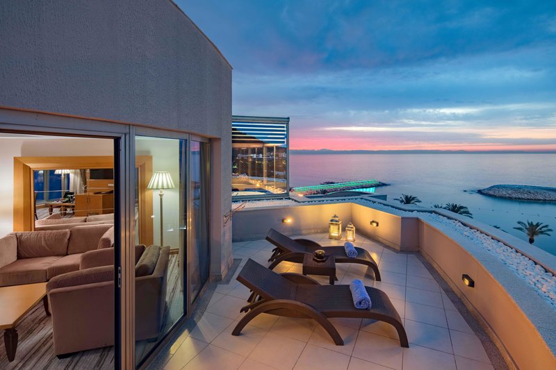Rooms feature a living room, a kitchen and a bathroom. Air conditioning and central heating ensure comfortable temperatures. Guests can relax and enjoy the sea views from the balcony or private terrace of some rooms. All rooms are carpeted and have a double bed, a king-size bed or a sofa bed. Separate bedrooms are available. Children's beds and extra beds can be requested for younger guests. A safe, a minibar and a desk are also available. For guests' convenience, units include a mini fridge and a tea/coffee station. An ironing set is provided for guests' convenience. Other features include a direct dial telephone, a flatscreen television with satellite/cable channels, a radio, a DVD player and WiFi. A turndown service provides guests with additional comfort in the evening hours. Little extras include slippers, daily paper and pillow menu. The bathrooms have a shower, a bathtub and a whirlpool bath. A hairdryer, a vanity mirror, bathrobes and a telephone are available for daily use. 11 wheelchair-friendly rooms can be reserved. The hotel has 52 family rooms, non-smoking rooms and 1 smoking room.