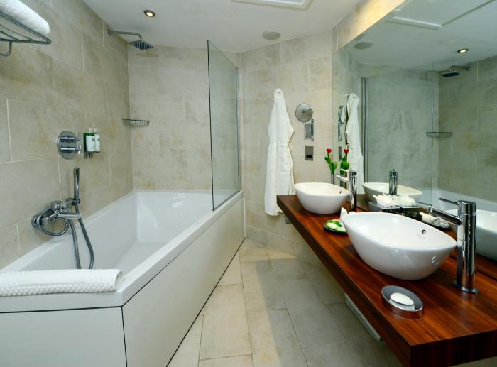 Air conditioning and individually adjustable heating ensure that rooms maintain comfortable temperatures. A balcony or terrace is among the standard features of some rooms. All rooms are carpeted and include a king-size bed. A safe and a minibar are also available. A mini fridge and a tea/coffee station are standard features. An ironing set is provided for guests' convenience. A direct dial telephone, a television with satellite/cable channels, a radio, a stereo system, a DVD player and WiFi are provided as well. Bathrooms are equipped with a shower, a bathtub and a whirlpool bath. A hairdryer and bathrobes are provided. The hotel has family rooms and 11 non-smoking rooms.