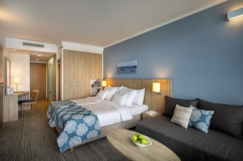 Rooms are equipped with air conditioning. Guests have a sea view from the balcony or terrace, which are standard features of some rooms. Guests are sure to get a good night's sleep in the sofa bed. Extra beds or children's beds can be provided upon request. A safe provides secure storage for guests' personal property. Additional features include a mini fridge, a microwave and a tea/coffee station. A flatscreen television with satellite channels and WiFi (no extra charge) are provided as well. A hairdryer and a telephone are on hand in the bathrooms for everyday use.