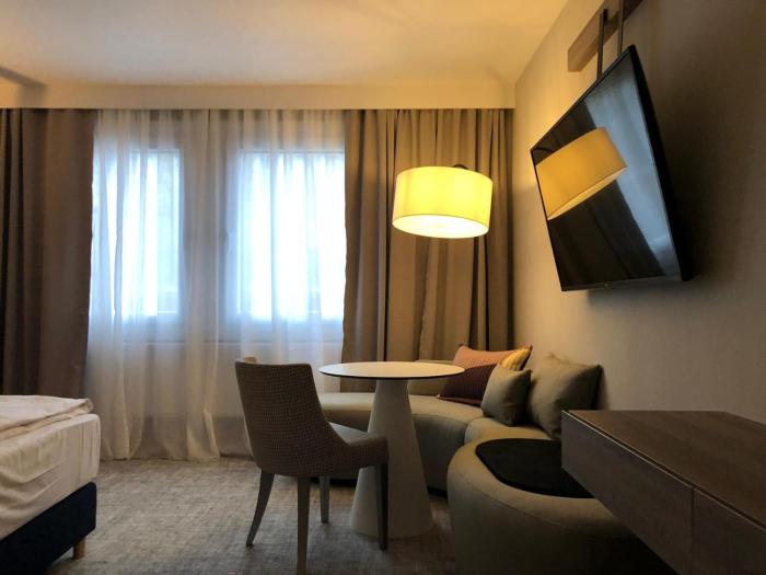 Rooms are equipped with individually adjustable heating. All rooms are carpeted and include a double bed or a king-size bed. A safe and a minibar are also available. A mini fridge and a tea/coffee station are standard features. A direct dial telephone, a television with satellite/cable channels, a radio and WiFi are provided as well. Bathrooms are equipped with a shower and a bathtub, as well as a hairdryer. The hotel has family rooms and 130 non-smoking rooms.